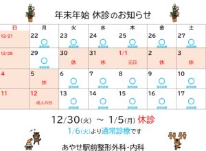 あやせ駅前整形外科・内科は12/30(火)~1/5(月)休診