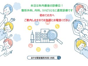 あやせ駅前整形外科・内科は、 本日が年内最後の診療日 。整形外科、※内科、リハビリともに通常診療です!